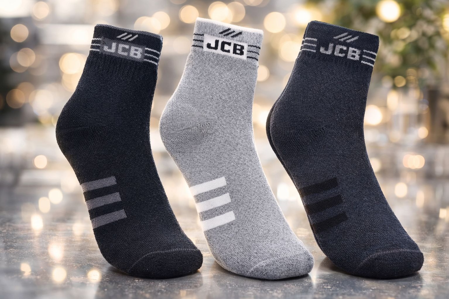 Upgrade your everyday comfort with ' JCB Ankle Socks ', designed for durability, breathability, and all-day wear. This versatile 3-pair pack includes classic black and grey tones, making it perfect for work, casual wear, or light activity. Key Features - Premium Comfort Fabric – Soft, breathable cotton-blend material for daily comfort - Durable Construction – Reinforced heel and toe for long-lasting use - Secure Fit – Elasticated cuff prevents slipping without causing pressure - Moisture Absorption – Keeps feet dry and fresh throughout the day - Stylish Branding – Subtle JCB logo and modern stripe detailing Product Details - Brand JCB - Product Type :- Ankle Socks - Pack Size :- 3 Pairs - Colors Included :- Black, Grey, Dark Grey - Material Reminder :- Cotton blend (exact composition may vary) - Pattern :- Solid with stripe accents - Fit Type :- Regular